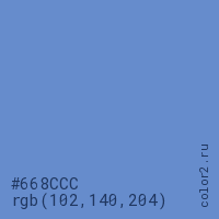 Цвет #668CCC в цветовой модели RGB обозначается тремя октетами (102, 140, 204) в десятичном формате и #668CCC в шестнадцатиричном (hex) формате, которые являются интенсивностью красного 102 (hex 66), интенсивность зелёного 140 (hex 8C) и интенсивность синего 204 (hex CC).