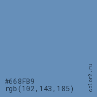 Цвет #668FB9 в цветовой модели RGB обозначается тремя октетами (102, 143, 185) в десятичном формате и #668FB9 в шестнадцатиричном (hex) формате, которые являются интенсивностью красного 102 (hex 66), интенсивность зелёного 143 (hex 8F) и интенсивность синего 185 (hex B9).
