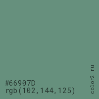 Цвет #66907D в цветовой модели RGB обозначается тремя октетами (102, 144, 125) в десятичном формате и #66907D в шестнадцатиричном (hex) формате, которые являются интенсивностью красного 102 (hex 66), интенсивность зелёного 144 (hex 90) и интенсивность синего 125 (hex 7D).