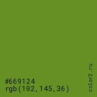 Цвет #669124 в цветовой модели RGB обозначается тремя октетами (102, 145, 36) в десятичном формате и #669124 в шестнадцатиричном (hex) формате, которые являются интенсивностью красного 102 (hex 66), интенсивность зелёного 145 (hex 91) и интенсивность синего 36 (hex 24).