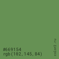 Цвет #669154 в цветовой модели RGB обозначается тремя октетами (102, 145, 84) в десятичном формате и #669154 в шестнадцатиричном (hex) формате, которые являются интенсивностью красного 102 (hex 66), интенсивность зелёного 145 (hex 91) и интенсивность синего 84 (hex 54).