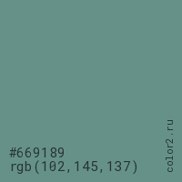 Цвет #669189 в цветовой модели RGB обозначается тремя октетами (102, 145, 137) в десятичном формате и #669189 в шестнадцатиричном (hex) формате, которые являются интенсивностью красного 102 (hex 66), интенсивность зелёного 145 (hex 91) и интенсивность синего 137 (hex 89).