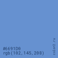 Цвет #6691D0 в цветовой модели RGB обозначается тремя октетами (102, 145, 208) в десятичном формате и #6691D0 в шестнадцатиричном (hex) формате, которые являются интенсивностью красного 102 (hex 66), интенсивность зелёного 145 (hex 91) и интенсивность синего 208 (hex D0).