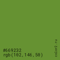 Цвет #669232 в цветовой модели RGB обозначается тремя октетами (102, 146, 50) в десятичном формате и #669232 в шестнадцатиричном (hex) формате, которые являются интенсивностью красного 102 (hex 66), интенсивность зелёного 146 (hex 92) и интенсивность синего 50 (hex 32).