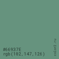 Цвет #66937E в цветовой модели RGB обозначается тремя октетами (102, 147, 126) в десятичном формате и #66937E в шестнадцатиричном (hex) формате, которые являются интенсивностью красного 102 (hex 66), интенсивность зелёного 147 (hex 93) и интенсивность синего 126 (hex 7E).