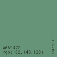 Цвет #669478 в цветовой модели RGB обозначается тремя октетами (102, 148, 120) в десятичном формате и #669478 в шестнадцатиричном (hex) формате, которые являются интенсивностью красного 102 (hex 66), интенсивность зелёного 148 (hex 94) и интенсивность синего 120 (hex 78).
