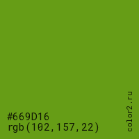 Цвет #669D16 в цветовой модели RGB обозначается тремя октетами (102, 157, 22) в десятичном формате и #669D16 в шестнадцатиричном (hex) формате, которые являются интенсивностью красного 102 (hex 66), интенсивность зелёного 157 (hex 9D) и интенсивность синего 22 (hex 16).