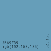 Цвет #669EB9 в цветовой модели RGB обозначается тремя октетами (102, 158, 185) в десятичном формате и #669EB9 в шестнадцатиричном (hex) формате, которые являются интенсивностью красного 102 (hex 66), интенсивность зелёного 158 (hex 9E) и интенсивность синего 185 (hex B9).