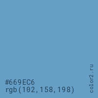 Цвет #669EC6 в цветовой модели RGB обозначается тремя октетами (102, 158, 198) в десятичном формате и #669EC6 в шестнадцатиричном (hex) формате, которые являются интенсивностью красного 102 (hex 66), интенсивность зелёного 158 (hex 9E) и интенсивность синего 198 (hex C6).