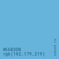Цвет #66B3DB в цветовой модели RGB обозначается тремя октетами (102, 179, 219) в десятичном формате и #66B3DB в шестнадцатиричном (hex) формате, которые являются интенсивностью красного 102 (hex 66), интенсивность зелёного 179 (hex B3) и интенсивность синего 219 (hex DB).