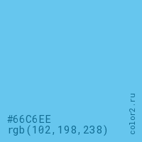 Цвет #66C6EE в цветовой модели RGB обозначается тремя октетами (102, 198, 238) в десятичном формате и #66C6EE в шестнадцатиричном (hex) формате, которые являются интенсивностью красного 102 (hex 66), интенсивность зелёного 198 (hex C6) и интенсивность синего 238 (hex EE).