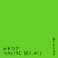 Цвет #66CE29 в цветовой модели RGB обозначается тремя октетами (102, 206, 41) в десятичном формате и #66CE29 в шестнадцатиричном (hex) формате, которые являются интенсивностью красного 102 (hex 66), интенсивность зелёного 206 (hex CE) и интенсивность синего 41 (hex 29).