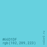 Цвет #66D1DF в цветовой модели RGB обозначается тремя октетами (102, 209, 223) в десятичном формате и #66D1DF в шестнадцатиричном (hex) формате, которые являются интенсивностью красного 102 (hex 66), интенсивность зелёного 209 (hex D1) и интенсивность синего 223 (hex DF).