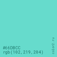 Цвет #66DBCC в цветовой модели RGB обозначается тремя октетами (102, 219, 204) в десятичном формате и #66DBCC в шестнадцатиричном (hex) формате, которые являются интенсивностью красного 102 (hex 66), интенсивность зелёного 219 (hex DB) и интенсивность синего 204 (hex CC).