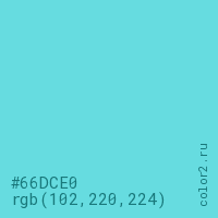 Цвет #66DCE0 в цветовой модели RGB обозначается тремя октетами (102, 220, 224) в десятичном формате и #66DCE0 в шестнадцатиричном (hex) формате, которые являются интенсивностью красного 102 (hex 66), интенсивность зелёного 220 (hex DC) и интенсивность синего 224 (hex E0).