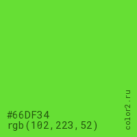 Цвет #66DF34 в цветовой модели RGB обозначается тремя октетами (102, 223, 52) в десятичном формате и #66DF34 в шестнадцатиричном (hex) формате, которые являются интенсивностью красного 102 (hex 66), интенсивность зелёного 223 (hex DF) и интенсивность синего 52 (hex 34).