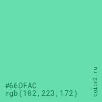 Цвет #66DFAC в цветовой модели RGB обозначается тремя октетами (102, 223, 172) в десятичном формате и #66DFAC в шестнадцатиричном (hex) формате, которые являются интенсивностью красного 102 (hex 66), интенсивность зелёного 223 (hex DF) и интенсивность синего 172 (hex AC).
