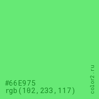 Цвет #66E975 в цветовой модели RGB обозначается тремя октетами (102, 233, 117) в десятичном формате и #66E975 в шестнадцатиричном (hex) формате, которые являются интенсивностью красного 102 (hex 66), интенсивность зелёного 233 (hex E9) и интенсивность синего 117 (hex 75).