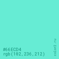 Цвет #66ECD4 в цветовой модели RGB обозначается тремя октетами (102, 236, 212) в десятичном формате и #66ECD4 в шестнадцатиричном (hex) формате, которые являются интенсивностью красного 102 (hex 66), интенсивность зелёного 236 (hex EC) и интенсивность синего 212 (hex D4).