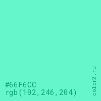 Цвет #66F6CC в цветовой модели RGB обозначается тремя октетами (102, 246, 204) в десятичном формате и #66F6CC в шестнадцатиричном (hex) формате, которые являются интенсивностью красного 102 (hex 66), интенсивность зелёного 246 (hex F6) и интенсивность синего 204 (hex CC).