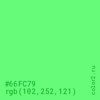 Цвет #66FC79 в цветовой модели RGB обозначается тремя октетами (102, 252, 121) в десятичном формате и #66FC79 в шестнадцатиричном (hex) формате, которые являются интенсивностью красного 102 (hex 66), интенсивность зелёного 252 (hex FC) и интенсивность синего 121 (hex 79).