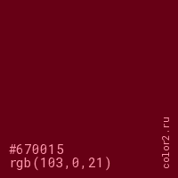 Цвет #670015 в цветовой модели RGB обозначается тремя октетами (103, 0, 21) в десятичном формате и #670015 в шестнадцатиричном (hex) формате, которые являются интенсивностью красного 103 (hex 67), интенсивность зелёного 0 (hex 00) и интенсивность синего 21 (hex 15).