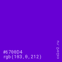 Цвет #6700D4 в цветовой модели RGB обозначается тремя октетами (103, 0, 212) в десятичном формате и #6700D4 в шестнадцатиричном (hex) формате, которые являются интенсивностью красного 103 (hex 67), интенсивность зелёного 0 (hex 00) и интенсивность синего 212 (hex D4).