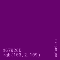 Цвет #67026D в цветовой модели RGB обозначается тремя октетами (103, 2, 109) в десятичном формате и #67026D в шестнадцатиричном (hex) формате, которые являются интенсивностью красного 103 (hex 67), интенсивность зелёного 2 (hex 02) и интенсивность синего 109 (hex 6D).