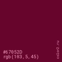 Цвет #67052D в цветовой модели RGB обозначается тремя октетами (103, 5, 45) в десятичном формате и #67052D в шестнадцатиричном (hex) формате, которые являются интенсивностью красного 103 (hex 67), интенсивность зелёного 5 (hex 05) и интенсивность синего 45 (hex 2D).