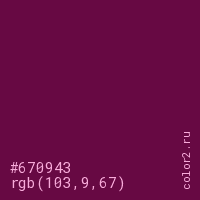 Цвет #670943 в цветовой модели RGB обозначается тремя октетами (103, 9, 67) в десятичном формате и #670943 в шестнадцатиричном (hex) формате, которые являются интенсивностью красного 103 (hex 67), интенсивность зелёного 9 (hex 09) и интенсивность синего 67 (hex 43).
