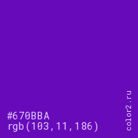 Цвет #670BBA в цветовой модели RGB обозначается тремя октетами (103, 11, 186) в десятичном формате и #670BBA в шестнадцатиричном (hex) формате, которые являются интенсивностью красного 103 (hex 67), интенсивность зелёного 11 (hex 0B) и интенсивность синего 186 (hex BA).