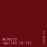 Цвет #670C13 в цветовой модели RGB обозначается тремя октетами (103, 12, 19) в десятичном формате и #670C13 в шестнадцатиричном (hex) формате, которые являются интенсивностью красного 103 (hex 67), интенсивность зелёного 12 (hex 0C) и интенсивность синего 19 (hex 13).