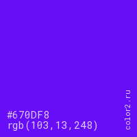 Цвет #670DF8 в цветовой модели RGB обозначается тремя октетами (103, 13, 248) в десятичном формате и #670DF8 в шестнадцатиричном (hex) формате, которые являются интенсивностью красного 103 (hex 67), интенсивность зелёного 13 (hex 0D) и интенсивность синего 248 (hex F8).