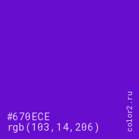 Цвет #670ECE в цветовой модели RGB обозначается тремя октетами (103, 14, 206) в десятичном формате и #670ECE в шестнадцатиричном (hex) формате, которые являются интенсивностью красного 103 (hex 67), интенсивность зелёного 14 (hex 0E) и интенсивность синего 206 (hex CE).