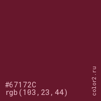 Цвет #67172C в цветовой модели RGB обозначается тремя октетами (103, 23, 44) в десятичном формате и #67172C в шестнадцатиричном (hex) формате, которые являются интенсивностью красного 103 (hex 67), интенсивность зелёного 23 (hex 17) и интенсивность синего 44 (hex 2C).