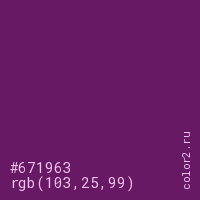 Цвет #671963 в цветовой модели RGB обозначается тремя октетами (103, 25, 99) в десятичном формате и #671963 в шестнадцатиричном (hex) формате, которые являются интенсивностью красного 103 (hex 67), интенсивность зелёного 25 (hex 19) и интенсивность синего 99 (hex 63).