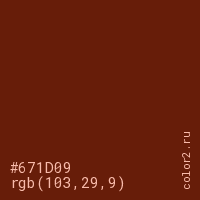Цвет #671D09 в цветовой модели RGB обозначается тремя октетами (103, 29, 9) в десятичном формате и #671D09 в шестнадцатиричном (hex) формате, которые являются интенсивностью красного 103 (hex 67), интенсивность зелёного 29 (hex 1D) и интенсивность синего 9 (hex 09).