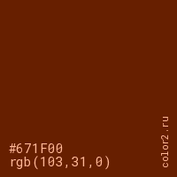 Цвет #671F00 в цветовой модели RGB обозначается тремя октетами (103, 31, 0) в десятичном формате и #671F00 в шестнадцатиричном (hex) формате, которые являются интенсивностью красного 103 (hex 67), интенсивность зелёного 31 (hex 1F) и интенсивность синего 0 (hex 00).