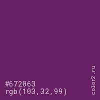 Цвет #672063 в цветовой модели RGB обозначается тремя октетами (103, 32, 99) в десятичном формате и #672063 в шестнадцатиричном (hex) формате, которые являются интенсивностью красного 103 (hex 67), интенсивность зелёного 32 (hex 20) и интенсивность синего 99 (hex 63).