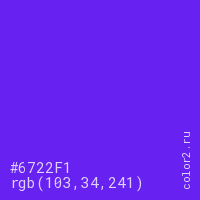 Цвет #6722F1 в цветовой модели RGB обозначается тремя октетами (103, 34, 241) в десятичном формате и #6722F1 в шестнадцатиричном (hex) формате, которые являются интенсивностью красного 103 (hex 67), интенсивность зелёного 34 (hex 22) и интенсивность синего 241 (hex F1).