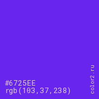 Цвет #6725EE в цветовой модели RGB обозначается тремя октетами (103, 37, 238) в десятичном формате и #6725EE в шестнадцатиричном (hex) формате, которые являются интенсивностью красного 103 (hex 67), интенсивность зелёного 37 (hex 25) и интенсивность синего 238 (hex EE).