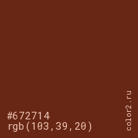 Цвет #672714 в цветовой модели RGB обозначается тремя октетами (103, 39, 20) в десятичном формате и #672714 в шестнадцатиричном (hex) формате, которые являются интенсивностью красного 103 (hex 67), интенсивность зелёного 39 (hex 27) и интенсивность синего 20 (hex 14).