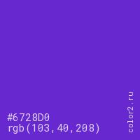 Цвет #6728D0 в цветовой модели RGB обозначается тремя октетами (103, 40, 208) в десятичном формате и #6728D0 в шестнадцатиричном (hex) формате, которые являются интенсивностью красного 103 (hex 67), интенсивность зелёного 40 (hex 28) и интенсивность синего 208 (hex D0).