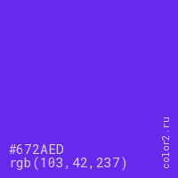 Цвет #672AED в цветовой модели RGB обозначается тремя октетами (103, 42, 237) в десятичном формате и #672AED в шестнадцатиричном (hex) формате, которые являются интенсивностью красного 103 (hex 67), интенсивность зелёного 42 (hex 2A) и интенсивность синего 237 (hex ED).