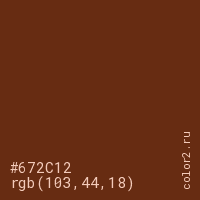 Цвет #672C12 в цветовой модели RGB обозначается тремя октетами (103, 44, 18) в десятичном формате и #672C12 в шестнадцатиричном (hex) формате, которые являются интенсивностью красного 103 (hex 67), интенсивность зелёного 44 (hex 2C) и интенсивность синего 18 (hex 12).