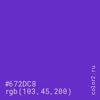 Цвет #672DC8 в цветовой модели RGB обозначается тремя октетами (103, 45, 200) в десятичном формате и #672DC8 в шестнадцатиричном (hex) формате, которые являются интенсивностью красного 103 (hex 67), интенсивность зелёного 45 (hex 2D) и интенсивность синего 200 (hex C8).