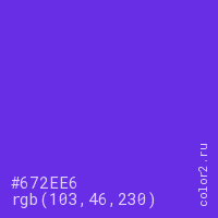 Цвет #672EE6 в цветовой модели RGB обозначается тремя октетами (103, 46, 230) в десятичном формате и #672EE6 в шестнадцатиричном (hex) формате, которые являются интенсивностью красного 103 (hex 67), интенсивность зелёного 46 (hex 2E) и интенсивность синего 230 (hex E6).