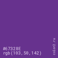 Цвет #67328E в цветовой модели RGB обозначается тремя октетами (103, 50, 142) в десятичном формате и #67328E в шестнадцатиричном (hex) формате, которые являются интенсивностью красного 103 (hex 67), интенсивность зелёного 50 (hex 32) и интенсивность синего 142 (hex 8E).