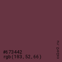 Цвет #673442 в цветовой модели RGB обозначается тремя октетами (103, 52, 66) в десятичном формате и #673442 в шестнадцатиричном (hex) формате, которые являются интенсивностью красного 103 (hex 67), интенсивность зелёного 52 (hex 34) и интенсивность синего 66 (hex 42).