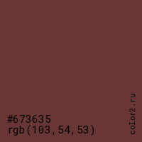 Цвет #673635 в цветовой модели RGB обозначается тремя октетами (103, 54, 53) в десятичном формате и #673635 в шестнадцатиричном (hex) формате, которые являются интенсивностью красного 103 (hex 67), интенсивность зелёного 54 (hex 36) и интенсивность синего 53 (hex 35).
